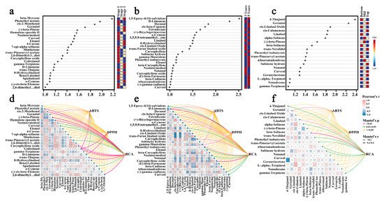 As shown in Figure 6d–f and Figure 7a, 17 VOCs were identified as key active VOCs, including D-limonene, cis-β-copaene, (+)-bi-cyclo-germacrene, caryophyllene, γ-muurolene, caryophyllene oxide, geraniol, cis-calamenene, (-)-β-pinene, phenethyl acetate, cis-2-menthenol, humulene epoxide ii, mint-ketone, 2,6-dimethyl-3,7-octadiene-2,6-diol, cedrelanol, trans-thujone and 1,7-octadiene-3,6-diol,2,6-dimethyl-. D-limonene exhibits notable antioxidant activity. In the study of Ewais et al., D-limonene treatment significantly elevated antioxidant enzyme levels, including glutathione peroxidase (GPX), catalase (CAT) and superoxide dismutase (SOD) [68], while reducing oxidative stress markers such as malondialdehyde (MDA) and nitric oxide (NO) [69]. Other terpenes in Z. armatum, including sabinene, terpinene, myrcene and cymene, have demonstrated antioxidant properties in prior studies through lipid peroxidation inhibition and endogenous antioxidant system enhancement [70]. However, these effects were not observed in the current study, likely due to their low concentrations in Z. armatum. Phytochemicals, namely TFC and TPC, were significantly associated with antioxidant activity (p < 0.01). As for phenolic compounds, increasing evidence proves their protective activity against a multitude of human conditions [71], and they have been confirmed to possess antioxidant activity [72]. The present results illustrated key active VOCs and two phytochemicals linked to antioxidant activity. D-limonene, γ-muurolene and cedrelanol exhibited strong correlations with antioxidant activity, while most terpenes correlated significantly with RC (Figure 7c). Previous studies have indicated that terpenes possess antioxidant activity [73]. Terpenoid compounds are widely applied in human daily life and health, spanning various industries, including pharmaceuticals, nutraceuticals, food and beverage products, cosmetics, perfumery, synthetic chemicals, fragrance and flavor additives, rubber products, and biofuels [74]. This also provides new insights for the development of functional food by-products rich in terpenes.