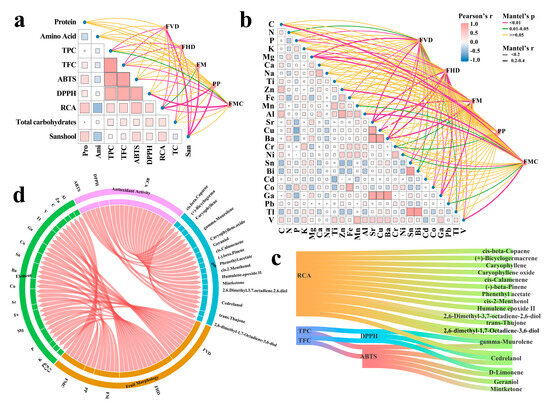Mantel tests of morphology metrics, phytochemical components, mineral elements, and integrative correlation analysis. (a) Morphology metrics with phytochemical components and antioxidant activity. (b) Morphology metrics with mineral elements. (c) Correlation between antioxidant activity and DMs, as well as phytochemical components. (d) Integrative correlation analysis.