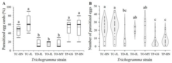 Determining host acceptance is generally assumed to be the first significant step in assessing appropriate biological control agents [,]. In this study, four strains from three species—T. chilonis TC-HN and TC-JL, T. ostriniae TO-JL, and T. pretiosum TH-HN—yielded promising results. Host acceptance (or host suitability) significantly varied between species, as demonstrated in this study and previous research [,,,]. Moreover, a high percentage of parasitized egg cards does not always correspond with a large number of parasitized eggs, which could be related to the host’s immune system [], the thickness and structure of the chorion [], or the readiness of females to attack the host [], as well as the host choice behavior [] or aggregation effect [] of female parasitoids. In this study, the opposite phenomenon was observed in the two strains of T. ostriniae, TO-JL and TO-MY, which exhibited a low percentage of parasitized egg cards followed by a high number of parasitized eggs. However, the two strains of T. chilonis, TC-HN and TC-JL, exhibited consistency between these two parameters.