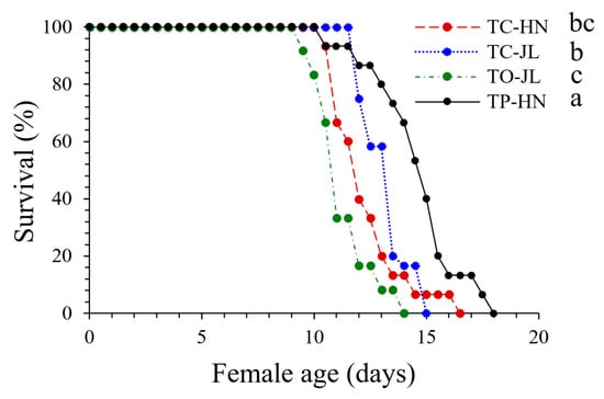 Survival of strains TC-HN and TC-JL of T. chilonis, strain TO-JL of T. ostriniae, and strain TP-HN of T. pretiosum on T. absoluta egg cards. Different lowercase letters indicate significant differences among survival curves at the p < 0.05 significance level (p-values are from log-rank (Mantel–Cox) test).