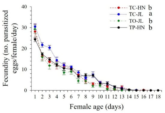Fecundity. All four Trichogramma strains parasitized more than one hundred T. absoluta eggs during their lifetime, but with significant differences between Trichogramma species/strains (F3,50 = 19.173, p < 0.0001) (Table 2). The lifetime fecundity was highest in strain TC-JL (TC-JL vs. TO-JL, p < 0.0001; TC-JL vs. TP-HN, p < 0.0001), followed by strains TC-HN (TC-HN vs. TO-JL, p = 0.0120) and TP-HN (TP-HN vs. TO-JL, p = 0.0010), with the lowest value observed in strain TO-JL; significant differences were observed between the two strains (TC-JL vs. TC-HN, p < 0.0001) of T. chilonis (Table 2). Moreover, investigation of daily egg production showed that fecundity was highest on the first day of adult emergence (Figure 3). During the first six days of egg oviposition, during which strains TC-HN, TC-JL, TO-JL, and TP-HN laid 80.36%, 77.56%, 85.57%, and 74.33% of their total number of eggs, respectively, the fecundity of strain TC-JL was significantly higher than that of the other three strains, TC-HN, TO-JL, and TP-HN (TC-JL vs. TC-HN, t = 2.8355, p = 0.0364; TC-JL vs. TO-JL, t = 3.4052, p = 0.0191; TC-JL vs. TP-HN, t = 3.9249, p = 0.0111) (Figure 3).