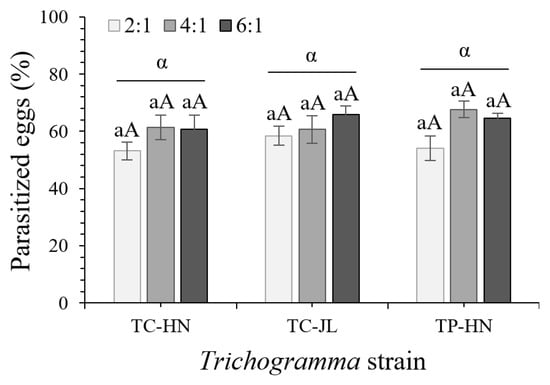 The parasitism tests, namely, the capacity for host location and acceptance, were performed on potted tomato plants in cages placed in an insectary. Three selected strains were assessed based on the findings of the above laboratory assessment: strains TC-HN and TC-JL of T. chilonis and TP-HN of T. pretiosum. Clean tomato plants (with 6 to 8 well-developed true leaves and not infected by any pests) were placed in a mass reproduction cage to allow T. absolua adults to lay eggs freely overnight. After 12 h (from 18:00 to 06:00), all adults were removed; between 90 and 105 eggs were retained on each plant, and extra eggs were removed using a fine-hair brush. The tomato plants were placed individually in cages (25 × 25 × 30 cm; mesh size, 150 × 150 µm; Xunon Instrument (Beijing) Co., Ltd., Beijing, China). Honey water (15% v/v) was used to provide nutrition to parasitoids. Trichogramma adults, aged less than 12 h old and fully mated (reared on the factitious hosts, inactivated C. cephalonica eggs), were released in defined parasitoid–host ratios of 2:1, 4:1, and 6:1, namely, inundative release [,], onto the middle parts of the tomato plants. After 24 h, parasitoids were removed, potted tomato plants were placed in another clean cage, and eggs were incubated on potted tomato plants in the insectary at 25–30 °C and 40–60% RH with a 14:10 (light/dark) photoperiod. After 6 d, the number of parasitized eggs (black eggs) was recorded. In total, the trials were performed 5 or 6 times to obtain 5 or 6 replications (TC-HN 4:1, 6 replications; all other strains and ratios, 5 replications) for each Trichogramma strain and each ratio. The parasitism capacity of the three selected Trichogramma strains on the caged potted tomato plants was identified via the proportion of parasitized host eggs (%). Parasitism rate (%) = (number of black host eggs/total number of provided host eggs) × 100%.