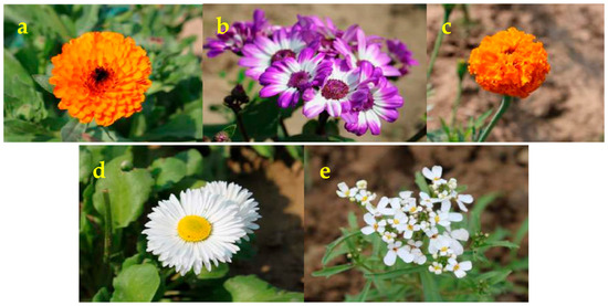 - Jankowska, B.; Wilk, A. Effect of pot marigold (Calendula officinalis L.) and cypress spurge (Euphorbia cyparissias L.) plant water extracts on the occurrence of pest insects on white cabbage. Folia Hortic. 2011, 23, 21–28. [Google Scholar] [CrossRef]