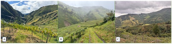 Factors such as temperature, solar radiation, altitude, precipitation, wind, and atmospheric pressure are factors that influence Andean crops, as is the case of P. ligularis, which develop in complex and extreme environmental conditions, which is why many of the species have unique adaptations [34,35]. The tropics do not have temperature seasons as marked as those in temperate zones, so the wet and dry seasons define the seasons to which plants react physiologically [36]. P. ligularis plantations are found in inter-Andean valleys and on mountain slopes, where the topography is varied but suitable for cultivation. These valleys have a steep geography, which favors water drainage and prevents waterlogging. The microclimate also plays a crucial role, since many times the cultivation areas are protected from strong winds by the surrounding mountains (Figure 3).