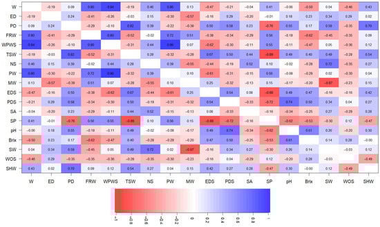 Correlation established between all the morphometric variables of P. ligularis. Fruit weight (W), fruit polar diameter (PD), fruit equatorial diameter (ED), epicarp weight (SHW), fleshy ring weight (FRW), seed pulp weight (WPWS), total seed weight (TSW), the number of seeds per fruit (NS), seedless pulp weight (PW), 10-seed mucilage weight (MW), seed weight (WOS), seed equatorial diameter (EDS), seed polar diameter (PDS), seed width (SW), seed area (SA), seed perimeter (SP), pH, and soluble solid content (TSS, °Brix). Values towards the number 1 indicate positive correlations, and those towards −1 indicate negative correlations. Dark-blue color indicates positive relationships between two variables, while red color indicates negative associations between variables.