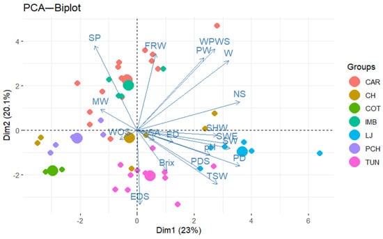 In PC1, the variables with the highest factor loading were fruit polar diameter, the number of seeds in the fruit, and seed width. PC2 was mainly associated with the variables seed perimeter (SP), fleshy ring weight (FRW), seeded pulp weight (WPWS), equatorial seed diameter (EDS), and seedless pulp weight (PW) (Figure 5). These results suggest that fruit selection in P. ligularis should be based on fruit diameter, fruit weight, seedless pulp weight, and seed weight. Nakasone and Paull [56] recommended genetic improvement of Passiflora species based on fruit shape and size, juice content, acidity, and total soluble solids.