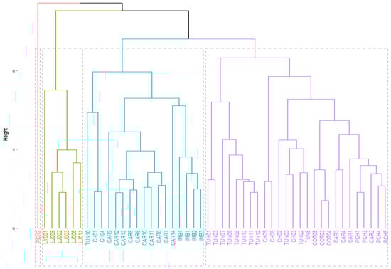 Analyses of variance were performed for all fruit parameters for each province. The relationship between variables was determined by Spearman’s rank correlation analysis (Spearman’s analysis was used because it is a suitable tool for exploring whether there is a general association, regardless of whether it is linear or not) [32], using R software version 4.3.3 [33]. Principal component analysis (PCA) was based on the correlation matrix between the characteristics, which were graphed in a two-dimensional plane to group the genotypes with R Core Team. The distance matrix was constructed using the Euclidean distance for cluster analysis. The minimum Ward distance method was used as a clustering method, where each cluster was given by the smallest increase in the value of the total sum of the squares of the differences existing within each cluster of each observation for the cluster centroid. Additionally, a dendrogram was generated using the Euclidean distance method and hierarchical clustering.