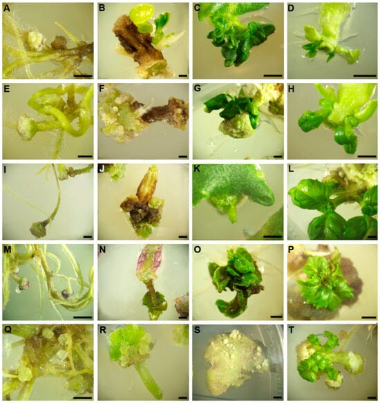 Example of NLMs (from root explants (A,E,I,M,Q)) or shoot formation in hypocotyls (B,F,J,N,R), in cotyledons (C,G,K,O,S), and on CNs (D,H,L,P,T) obtained after 4 weeks of regeneration induction, for all 5 cvs of O. basilicum ((A–D) ‘Prospera’; (E–H) ‘Paoletto’; (I–L) ‘FT Italiko’; (M–P) ‘Dark opal’; (Q–T) ‘Bolloso napoletano’ (scale bar 2 mm)).