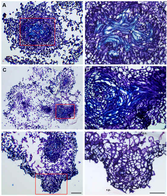 Histological investigation of cotyledons of O. basilicum cvs ‘Prospera’ (A,B), ‘Paoletto’ (C,D), and ‘FT Italiko’ (E,F). (A) General view of ‘Prospera’ cotyledon section at a high magnification and, in particular, undifferentiated cells (u.c.) and organized meristematic zones, magnified from the red rectangle in (B); (B) magnification of (A): presence of shoot primordia (s.p.) as new regenerated tissue after PGR induction. (C) Section of ‘Paoletto’ cotyledon at a high magnification: presence, at the same time, of meristematic activity, magnified in (D) from the red rectangle, root primordia formation (r.p.) and undifferentiated cell zones (u.c.). (D) Magnification of (C) meristematic zone with examples of meristematic centers (m.c.) connected to tracheary elements (t.e.) as evidence of vascularization in the regenerated tissues. (E) General view of ‘FT Italiko’ cotyledon at a high magnification, with root primordia formation (r.p.), undifferentiated cells (u.c.), and meristematic activity zones, magnified in (F) from the red rectangle. (F) Magnified view of meristematic centers (m.c.) and tracheary elements (t.e.) in ‘FT Italiko’ cotyledon. Scale bar: 200 µm (A,C,E) and 100 µm (B,D,F).