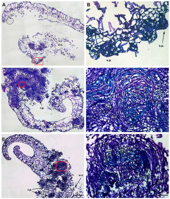 Histological analysis of NLMs from root explants of O. basilicum cvs ‘Prospera’ (A,B), ‘Paoletto’ (C,D), and ‘FT Italiko’ (E,F). (A) NLM section of ‘Prospera’ at a high magnification; (B) particular meristematic centers (m.c.) and tracheary elements (t.e.) observed in ‘Prospera’ NLM, magnified from red rectangle in (A); (C) NLM section of ‘Paoletto’ at a high magnification; (D) presence of tracheary elements (t.e.) connected to shoot apex (s.a.), as early structure of shoot neo-formation, magnified from the red rectangle in (C); (E) NLM section of ‘FT Italiko’ at a high magnification; and (F) example of presence of undifferentiated cells (u.c.) in NLM section of ‘FT Italiko’ and presence of root primordia (r.p.), as early formation of new adventitious root. The section is magnified from the red rectangle in (E). Scale bar: 200 µm (A,C,E) and 100 µm (B,D,F).
