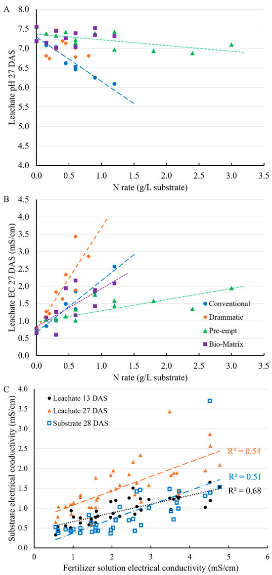 The leachate pH (A) and electrical conductivity (EC, (B)) responded to nitrogen rates (N rates) of different fertilizers. The EC of leachate at 13 and 27 DAS and the final substrate correlated with the EC of the initial fertilizer solutions (C). Each point represents an individual experimental unit (tray). The regression parameters of leachate solution properties in response to N rates can be found in Table S2.