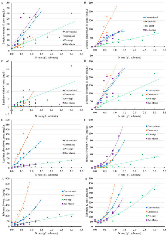 Nitrate-nitrogen (nitrate-N, (A)), ammonium-nitrogen (ammonium-N, (B)), nitrite-nitrogen (nitrite-N, (C)), inorganic nitrogen (inorganic N, sum of nitrate-N and ammonium-N, (D)), phosphorus (P, (E)) concentration in leachate solution at 27 days after sowing (DAS) as well as the nitrate-N (F), P (G) and potassium (K, (H)) concentration in substrate samples at 28 DAS. Each point represents an individual experimental unit (tray). The regression parameters of substrate and leachate nutrient solution in response to N rates can be found in Table S2.