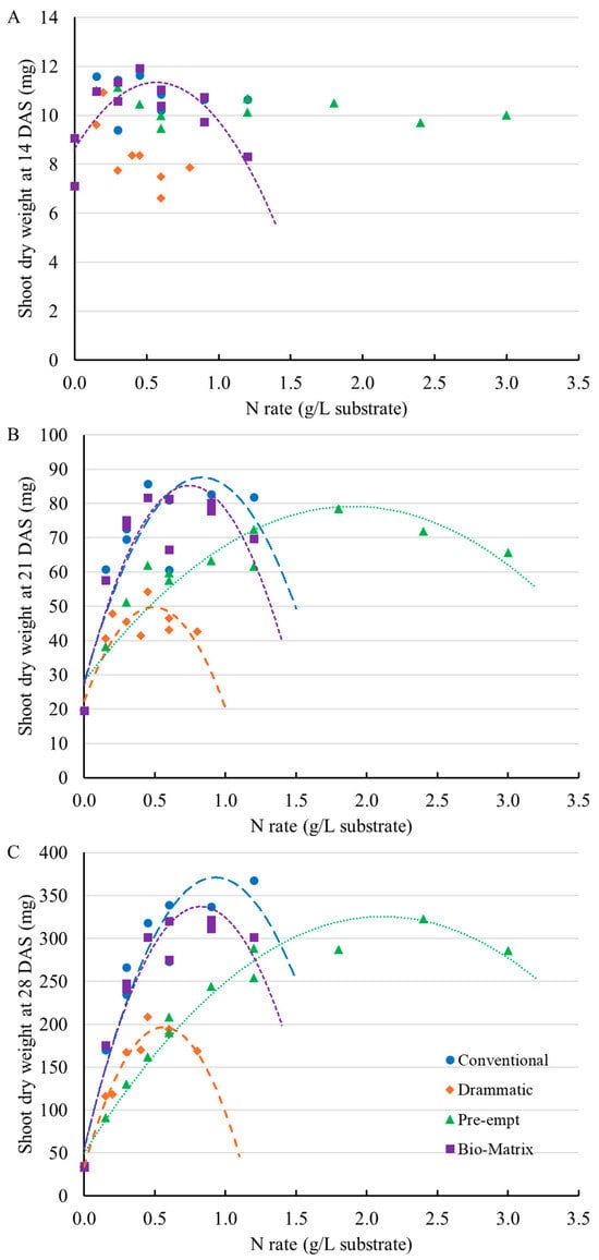 The shoot dry weight of bell pepper transplants at 14 (A), 21 (B), and 28 (C) days after sowing (DAS) responded to nitrogen application rates (N rates) of different fertilizers. Each point represents an individual experimental unit (tray). The regression parameters of shoot dry weight in response to N rates can be found in Table S2.