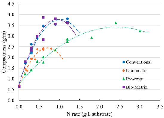 Plant height at 27 DAS also exhibited a quadratic response to the N rate for different fertilizers (Figure S3). Shoot compactness similarly followed a quadratic pattern (Figure 6). This pattern indicates that the low N rates at insufficient range and the high N rates at toxic range both resulted in suboptimal compactness (Figure 6). The conventional fertilizer, Pre-Empt, and Bio-Matrix reached similar compactness (3.77, 3.42, and 3.77 g/m, respectively, Figure 6, Table 2). But Drammatic resulted in a lower maximum compactness of 2.44 g/m at 0.70 g N/L (Figure 6, Table 2).