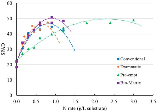 SPAD index of the bell pepper transplants at 27 days after sowing (DAS) responded to the nitrogen application rates (N rates) of different fertilizers. Each point represents an individual experimental unit (tray). The regression parameters of the SPAD index in response to N rates can be found in Table S2.
