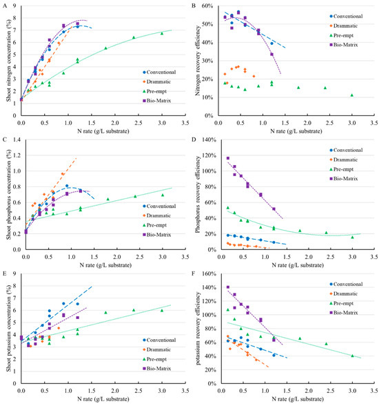 For shoot P concentration, Drammatic resulted in a linear increase in shoot P in response to N rate (Figure 8C). The conventional fertilizer and Bio-Matrix exhibited a quadratic response, with shoot P concentration reaching a plateau before declining with N rate (Figure 8C). On the other hand, Pre-Empt resulted in a much more gradual linear increase in shoot P concentration. The P recovery efficiency decreased with increasing N rates for all fertilizers (Figure 8D). The highest P recovery efficiency was observed with Bio-Matrix, followed by Pre-Empt, while the conventional fertilizer consistently showed the lowest P recovery efficiency (Figure 8D). The shoot potassium (K) concentration increased linearly with the N rate for all fertilizers, except for Drammatic (Figure 8E). This increase was faster with conventional fertilizer (Figure 8E). K recovery efficiency, much like P recovery efficiency, decreased as the N rate increased across all treatments (Figure 8F). The highest K recovery efficiency was observed with the Pre-Empt and Bio-Matrix (Figure 8F).
