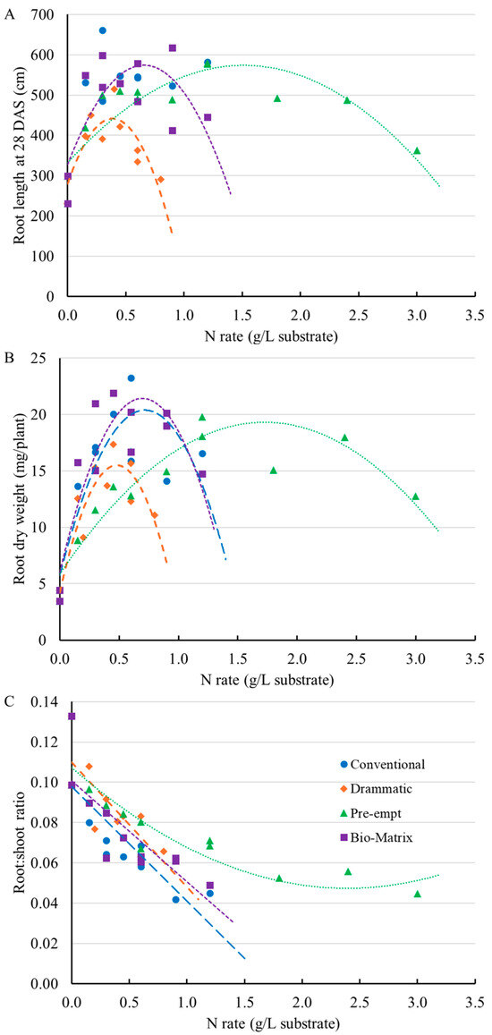 Similar to the trends observed for shoot growth (Figure 5C), root length and root dry weight were higher with conventional fertilizer and Bio-Matrix than with Drammatic across the tested N rates (Figure 9A,B). Peak root dry weight with Drammatic (15.5 mg/plant) was also achieved at a lower N rate of 0.48 g/L (Figure 9B, Table 2). In contrast, conventional fertilizer and Bio-Matrix resulted in a peak root dry weight (20.4 and 21.4 mg/plant, respectively) at N rates of 0.72 and 0.70 g/L, respectively (Figure 9B, Table 2). For Pre-Empt, maximum root dry weight (19.3 mg/plant) was lower than conventional fertilizer and Bio-Matrix but was achieved at a substantially higher N rate of 1.73 g/L (Figure 9B, Table 2). The peak root growth was achieved at lower nitrogen rates than shoot growth for all fertilizers we tested (Table 2).