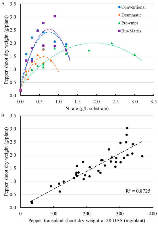 Shoot dry weight (A) of bell pepper plants after 18 days in the greenhouse responded to nitrogen application rates (N rates) of different fertilizers applied during the transplant stage and strongly correlated with transplant shoot dry weight on 28 DAS (B). Each point represents an individual experimental unit (tray). The regression parameters of pepper shoot dry weight 18 days after transplanting in response to N rates can be found in Table S2.