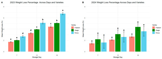 Weight loss (WL) was assessed across three cultivars (‘Prime-Ark® Freedom’, ‘Osage’, and ‘Sweet-Ark™ Ponca’) at Days 7, 12, and 16 under cold storage during the 2023 and 2024 growing seasons (Figure 1). Each data point represents the mean percent loss per clamshell (n = 3).