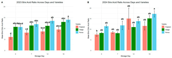 Soluble solids content (Brix)/total titratable acid ratio in the fruit of three blackberry cultivars at Days 0, 7, 12, and 16 after cold storage in 2023 (A) and 2024 (B). All means were separated using Tukey’s HSD test. Different letters within each time point indicate significant differences among cultivars (p < 0.05). Error bars represent ±SE.