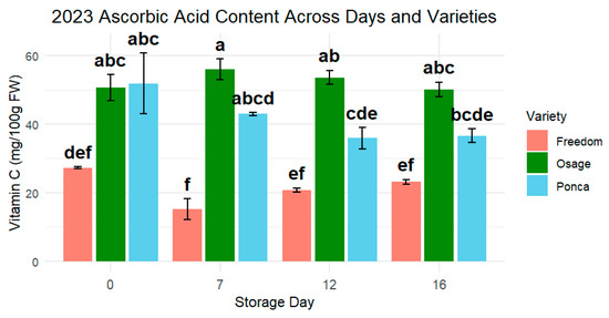 2023: Mean ascorbic acid content (mg/100 g FW) varied significantly (p = 4.48 × 10−9) among cultivar and storage duration combinations (Figure 3). At Day 0, ‘Osage’ (approx. 50 mg/100 g FW) and ‘Sweet-Ark™ Ponca’ (approx. 52 mg/100 g FW) had significantly higher ascorbic acid concentrations than ‘Prime-Ark™ Freedom’ (approx. 28 mg/100 g FW). Throughout the 16-day cold storage period, ‘Osage’ consistently maintained the highest ascorbic acid levels, peaking around Day 7 (approx. 55 mg/100 g FW) and remaining high by Day 16 (approx. 48 mg/100 g FW). In contrast, ‘Prime-Ark® Freedom’ showed the lowest initial ascorbic acid content and experienced a sharp, significant decline by Day 7 (approx. 15 mg/100 g FW), maintaining low levels thereafter. ‘Sweet-Ark™ Ponca’ started with a high ascorbic acid content but showed a progressive reduction over time, falling to approximately 37 mg/100 g FW by Day 16. Overall, ‘Osage’ demonstrated good ascorbic acid retention, while ‘Prime-Ark® Freedom’ exhibited the poorest.
