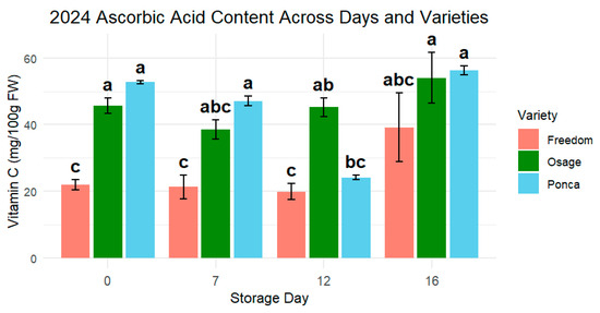 2024: Ascorbic acid content again varied significantly (p = 9.34 × 10−7) among cultivar and storage day combinations (Figure 4). At Day 0, ‘Sweet-Ark™ Ponca’ and ‘Osage’ exhibited significantly higher ascorbic acid concentrations (both approx. 48–50 mg/100 g FW) compared to ‘Prime-Ark™ Freedom’ (approx. 28 mg/100 g FW).