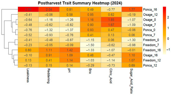 To further explore the complex interactions among various postharvest quality traits in 2024, a heatmap analysis was performed (Figure 5). This visualization summarizes the standardized values of leakiness, RDR, pH, Brix, citric acid, and sugar–acid ratio across different cultivar–storage day combinations, providing insights into their interrelationships and cultivar-specific patterns. The color gradient from yellow to red reflects increasing trait intensity, enabling rapid comparison of cultivar performance.