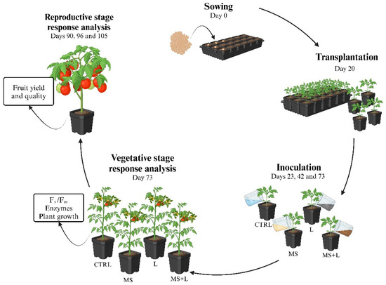 Experimental design to evaluate the biostimulant effects of marine Streptomyces and a Leonardite-based hydrolate in tomato plants. Treatments: control group (CTRL), Leonardite (L), marine Streptomyces (MS), and marine Streptomyces and Leonardite (MS + L). Figure elaborated in Biorender. Agreement number: DG27JTI4WB.
