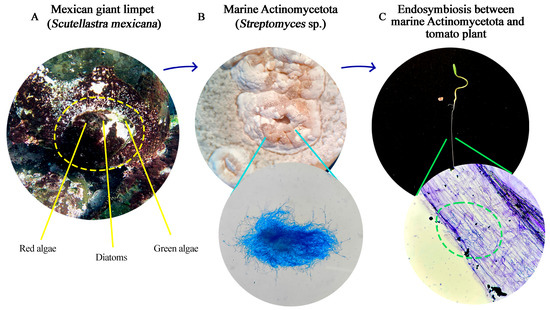Isolation and characterization of symbiotic actinomycete from the turf algae on the shell and garden of the Giant Mexican limpet Scutellastra mexicana. (A) Algal epibionts on the shell surface of Giant limpet S. mexicana, (B) colony (up) and cellular (down) morphology of the isolated algal symbiont actinomycetota Streptomyces sp., and (C) Tomato seedling roots showing Streptomyces sp. Filament localization within root tissue suggesting endophytic symbiosis.