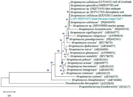 DNA was extracted from a LAP3 colony cultured in liquid A1 medium using the DNeasy® Blood and Tissue Kit (Qiagen, Germantown, MD, USA). The 16S rRNA gene was subsequently amplified using primers FC27 and RC1492 with DreamTaq Green Master Mix (Thermo Fisher Scientific, Waltham, MA, USA) under the following conditions: initial denaturation at 95 °C for 15 min; 32 cycles of 95 °C for 1 min, 61 °C for 1 min, and 72 °C for 1 min; followed by a final extension at 72 °C for 7 min [30]. PCR products were purified using the Wizard® SV Gel and PCR Clean-Up Kit (Promega, Madison, WI, USA), sequenced at UNAM Biotechnology Institute (Mexico City), and analyzed using BLAST (Basic Local Alignment Search Tool) available on the NCBI website (http://www.ncbi.nlm.nih.gov/). A neighbor-joining phylogenetic tree was constructed in MEGA with 1000 bootstrap replicates. The sequence was deposited in the GenBank database under accession number PQ555187 (http://www.ncbi.nlm.nih.gov/genbank, accessed on 10 August 2025).