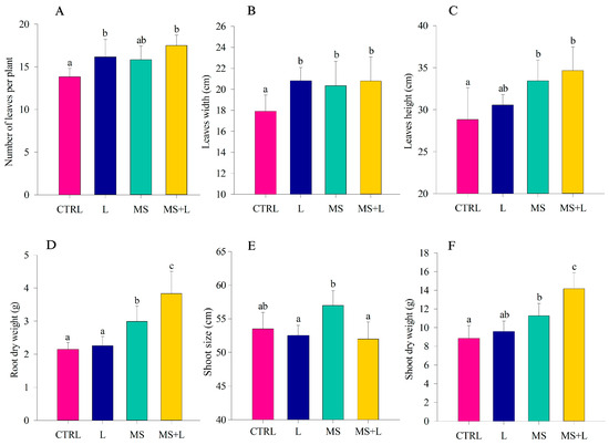 Significant variations in plant growth were observed in response to the biostimulant treatments, as shown in Figure 4. Compared to the control, plants treated with biostimulants L, MS, or MS + L exhibited a higher leaf number. Notably, the treatment (MS + L) resulted in a statistically significant 26.5% increase in leaf number relative to the control group. Leaf width increased by approximately 15% in all biostimulant-treated plants. Leaf height varied among treatments, with significantly larger leaves observed in MS and MS + L plants (Figure 4). Despite the differences found in leaf morphology, plant height (shoot size) remained similar.