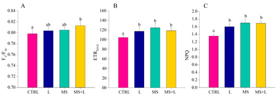 Photosynthetic performance was assessed to investigate the mechanism by which biostimulants promote growth. Maximum quantum efficiency (FV/FM) values in control plants (≈0.79) were not statistically different from those in L and MS treated plants (FV/FM ≈ 0.80 for both treatments; ANOVA, p > 0.5). However, the MS + L treatment showed a significantly higher quantum yield (FV/FM = 0.82 ± 0.003) than the other treatments, suggesting a photoprotective effect of the combined biostimulants on PSII (Figure 5A).