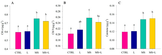 Photosynthetic pigments in tomato leaves at the vegetative stage under the different treatments. (A) Chlorophyll a, (B) Chlorophyll b, (C) Carotene. Treatments: control group (CTRL), Leonardite (L), LAP3 marine Streptomyces (MS), and LAP3 marine Streptomyces and Leonardite combined (MS + L). Chlorophyll (Chl). Values are presented as mean ± standard deviation (n = 6). Lowercase letters indicate statistical groups.