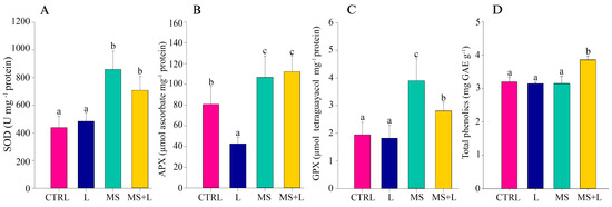 Antioxidant activity in tomato plants in response to inoculation with LAP3. (A) SOD: superoxide dismutase activity (U mg−1 protein), (B) APX: ascorbate peroxidase activity (µmol ascorbate mg−1 protein), (C) GPX: guaiacol peroxidase activity (µmol tetraguayacol mg−1 protein) (D) Total phenolics. Treatments: control group (CTRL), Leonardite (L), LAP3 marine Streptomyces (MS), and LAP3 marine Streptomyces and Leonardite combined (MS + L). Values are presented as mean ± standard deviation (n = 6). Lowercase letters indicate statistical groups.