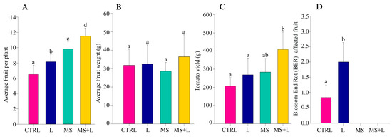 Effect of inoculation with LAP3 and Leonardite in yield parameters: Average fruit per plant (A), fruit weight (B), total yield per six plants (C) and number of fruits showing blossom end rot (D). Treatments: control group (CTRL), Leonardite (L), LAP3 marine Streptomyces (MS), and LAP3 marine Streptomyces and Leonardite combined (MS + L). Values are presented as mean ± standard deviation (n = 6). Lowercase letters indicate statistical groups.