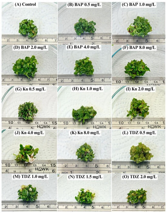 In plant micropropagation, various natural and synthetic cytokinins are used to stimulate growth, with their efficacy being highly dependent on the plant species, the type of explant used, and the specific developmental stage [23]. The literature documents the successful application of several cytokinins for shoot induction in the Philodendron genus. These primarily include adenine-type cytokinins such as BAP, BA, Kn, and 2-isopentenyl adenine (2iP), as well as the potent phenylurea-type cytokinin TDZ [5,6,24,25,26]. Of these, BAP, TDZ, and Kn are frequently reported as the most effective for inducing organogenesis in Philodendron. Building on these findings, the present study aimed to determine the optimal cytokinin and concentration for shoot proliferation of Philodendron ‘Pink Princess’. To achieve this, the effects of BAP, TDZ, and Kn were evaluated within a TIB culture system, with the results presented in Table 2 and Figure 1.