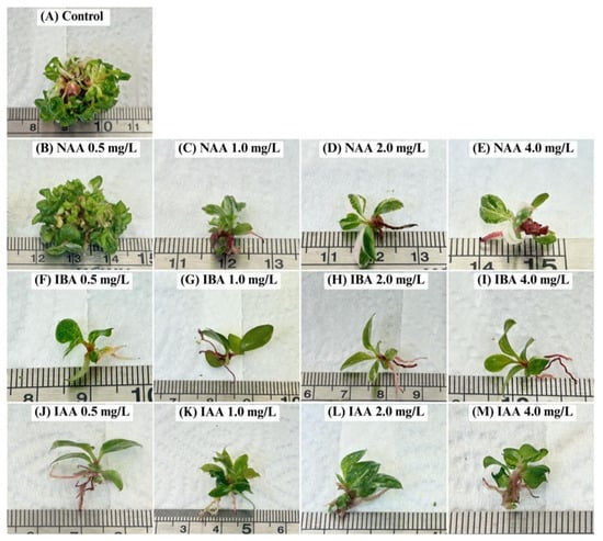 - Yunita, R.; Nugraha, M.F.I. Effect of auxin type and concentration on the induction of Alternanthera Reineckii roots in vitro. IOP Conf. Ser. Earth Environ. Sci. 2021, 653, 012073. [Google Scholar] [CrossRef]