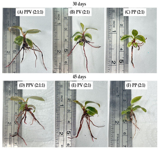 The Philodendron ‘Pink Princess’ plantlets after acclimatization for 30 and 45 days using peat moss, perlite, and vermiculite (PPV) at 2:1:1 (A,D); peat moss and vermiculite (PV) at 2:1 (B,E); and peat moss and perlite (PP) at 2:1 (C,F) as planting materials.