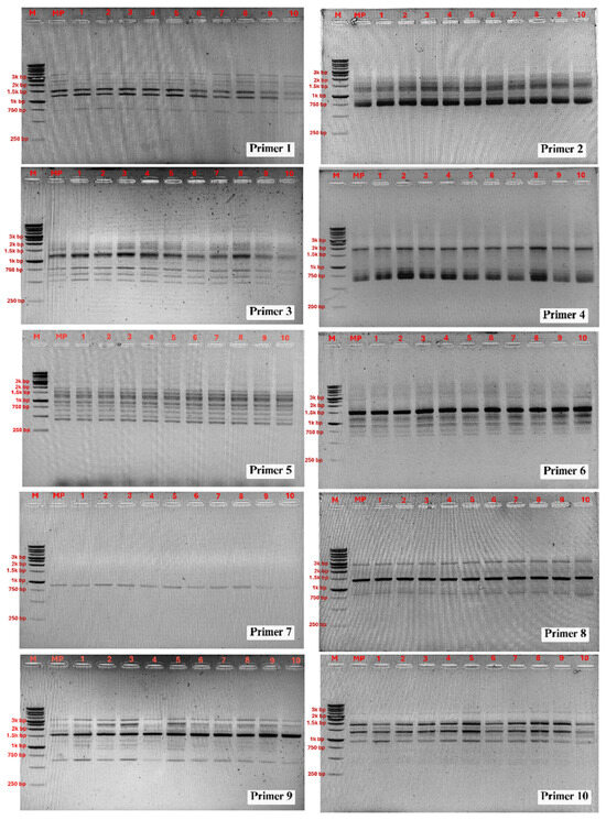 DNA amplification was performed using ten RAPD primers (Table 1). The 25 µL PCR reaction mixture contained 25 ng of genomic DNA template, 2.5 µL of 10× PCR buffer, 0.5 µL of dNTPs (10 mM), 1.0 µL of MgCl2 (50 mM), 0.125 µL of Taq DNA polymerase (5 U/µL), and 2.5 µL of primer (10 µM), and was brought to a final volume of 25 µL with nuclease-free water.