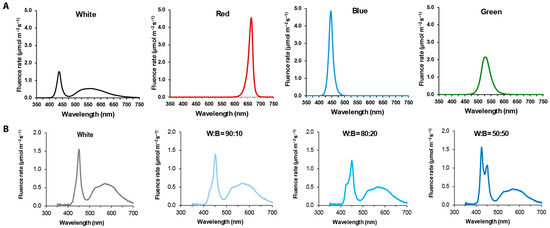 Spectroradiometer reading of the light qualities used in this study. All treatments represent the narrow-bandwidth or combined lights at 100 µmol·m−2·s−1 (A) and 120 µmol·m−2·s−1 (B) of PAR.