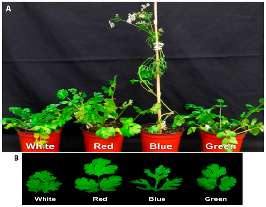 Effects of light quality on the growth and flowering (A) and the leaf patterns (B) of coriander plants. The plants were grown under different LEDs with a PAR of 100 µmol·m−2·s−1 for 7 weeks in a growth chamber maintained at 18 °C.