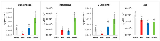 Volatiles were collected and analyzed from the leaves of coriander plants. The total amount of volatile compounds was highest in plants grown under W light and lowest in plants under B light compared to other plants (Figure 3 and Table 3). The primary volatile compounds identified in coriander, such as (E)-2-decenal, 2-undecenal, and 2-dodecenal, were higher in plants grown under G light.