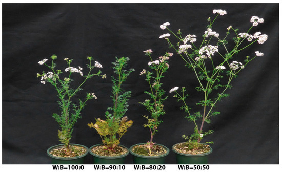 In the second experiment, we investigated the effects of varying intensities of B light (0%, 10%, 20%, or 50%) when combined with W light. Since coriander plants did not grow well at a PAR of 100 µmol·m−2·s−1, even under W light, we increased PAR to 120 µmol·m−2·s−1. Under the conditions of 10% and 20% B light (W:B, 90:10 and 80:20), coriander growth and flowering were inhibited, causing the leaves to turn yellow (Figure 4). However, when the B light intensity was increased to 50% (W:B, 50:50), coriander plants showed significantly improved growth without overgrowth. The plants began to grow taller after 6 weeks of light treatment and bloomed earlier, producing many flowers, more flower clusters, and longer flower nodes (Figure 4 and Table 4). The first flower appeared 38 days after the light treatments. In contrast, plants grown under the other B light intensities produced their first flowers after 52 days of treatment. There were no significant differences in leaf length, leaf width, leaf number, or branch number across the different light conditions.
