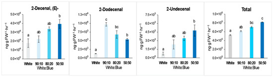 Representative volatile compounds from coriander flowers grown under various combinations of white and blue LEDs, providing 120 µmol·m−2·s−1 of PAR for 8 weeks. The bars indicate standard errors; the letters denote statistically significant differences between the plants (p < 0.001, Tukey’s test).