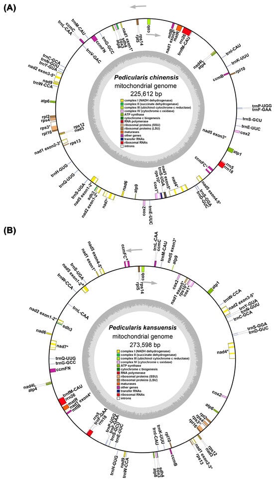 Pedicularis constitutes a considerable genus of parasitic plants within the family Orobanchaceae, encompassing approximately 600 species, primarily distributed in Asia, Europe, and North America [7,8]. Pedicularis plants display high morphological diversity and ecological adaptability, and thereby constitute ideal materials for the study of plant evolution and ecology. Nevertheless, the mitogenome information of Pedicularis plants remains scarce, with only a few species having partial or complete mitogenome sequences reported. For example, the known mitochondrial genome of P. rex is 219,859 bp in length and contains 56 genes, including 34 protein-coding genes, 19 tRNA genes, and 3 rRNA genes [9]. P. chinensis and P. kansuensis are distributed in montane grasslands of central and western China. As typical root hemiparasitic plants, both species interact with grasses or legumes through haustoria, thereby influencing community structure and interspecific competition [10]. Driven by multiple factors such as climate warming, high seed reproductive capacity, and low palatability to herbivores, P. kansuensis has widely spread across degraded grasslands on the Qinghai–Tibet Plateau [11,12].