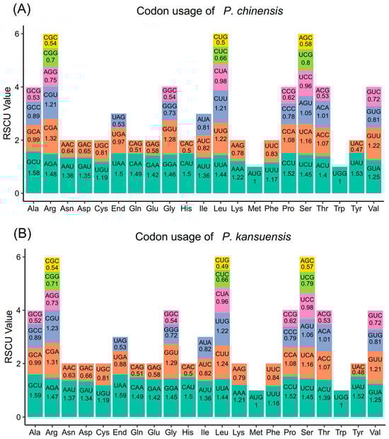 RSCU in the P. chinensis (A) and P. kansuensis (B) mitogenome. The x-axis represents codon families, while the RSCU values indicate the frequency at which a specific codon is observed relative to the expected frequency based on uniform synonymous codon usage.
