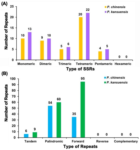 Analysis of repetitive sequences in P. chinensis and P. kansuensis. (A) The SSR analysis. The x-axis represents types of SSRs, while the y-axis indicates the count of repetitive segments. The yellow legend corresponds to P. chinensis, and the purple legend to P. kansuensis. (B) Dispersed repetitive sequence analysis. The x-axis represents the types of repetitive sequences, while the y-axis indicates the count of repetitive segments. The blue legend corresponds to P. chinensis, and the green legend corresponds to P. kansuensis.