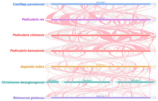 Additionally, collinearity analysis revealed extensive genome rearrangements and a lack of conserved synteny between Pedicularis and other Orobanchaceae species. Unique blank regions in P. chinensis and P. kansuensis suggest lineage-specific rearrangements, reflecting evolutionary plasticity. These findings support the hypothesis that dynamic genome rearrangements enable Pedicularis to adapt to diverse habitats, providing a competitive advantage [42].