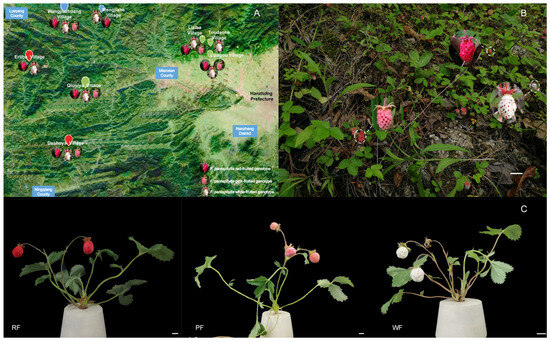 The F. pentaphylla plants used in this study grow on the southern slopes of the Qinling Mountains, within Mian County, Hanzhong City, Shaanxi Province (latitude 33°11′52–33°23′42″ N, longitude 106°38′57″–107°20′10″ E). These plants were cultivated in the ‘Wild Strawberry Resource Nursery’ at Jilin Agricultural University using stolon propagation to ensure that each fruit color had at least 100 plants. During the fruit maturation period, all red fruits (RF), pink fruit (PF), and white fruit (WF) were collected, immediately frozen in liquid nitrogen, and stored at −80 °C for later use (Figure 1).