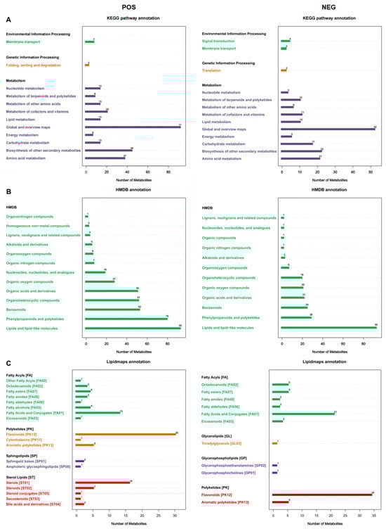 Metabolite analysis of fruit color differences in F. pentaphylla. (A) KEGG pathway annotation in POS and NEG. (B) HMDB annotation in POS and NEG. (C) Lipid maps annotation in POS and NEG.